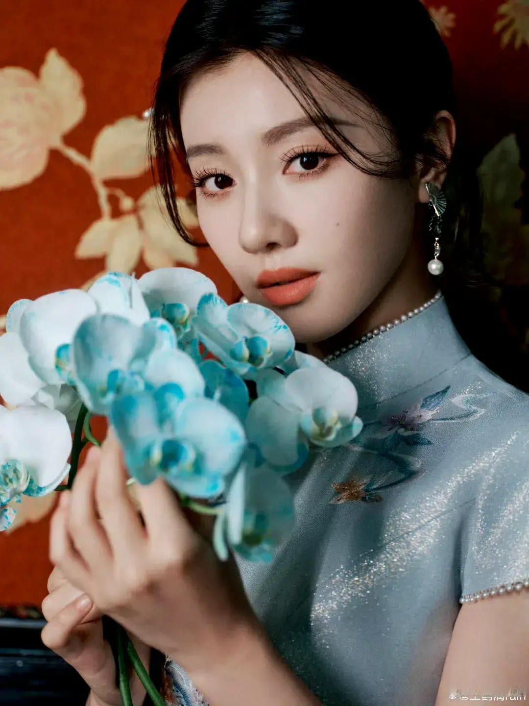 经历生死劫的她,穿着一身雪红的连衣裙,露出白皙的肩膀,搭配黑色丝绒手套,白色珍珠白,盘发。精致的妆容再搭配红色唇膏,整个艳光四射,完全看不出来昨天夜里的遭遇。